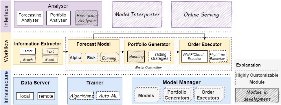 值得关注的一点就是这套量化系统的框架分为多层,每层由多个松散耦合的模块组成,因此每个模块用户都可以自行修改、定制、使用,如下图所示
