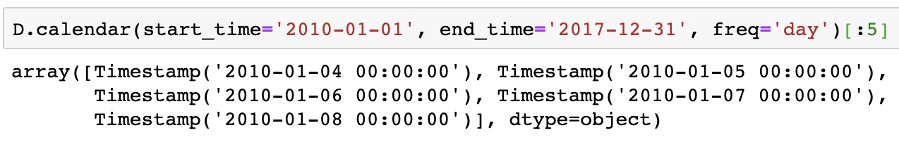 D.calendar(start_time='2010-01-01', end_time='2017-12-31', freq='day')[:5]