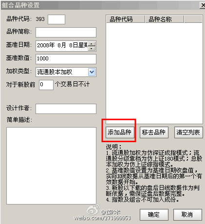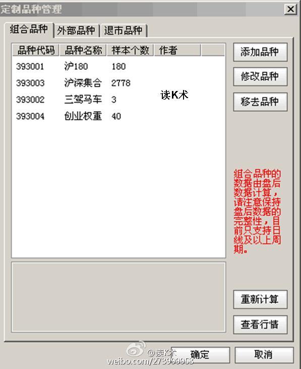 step1:依次打开通达信软件菜单【功能】——》【定制品种】——》【组合品种管理】,会出现如下界面:step2:点击“添加品种”,依次填写自编指数编码,品种简称,基准日期(尽量填得久些)基准数值(从100或者1000都可以),选择“流通股本加权计算“方法的加权类型(当然你也可以选择同等权重):step3:点击上图中红框中的”添加品种“,就可以选择自己想观察的自编指数个...