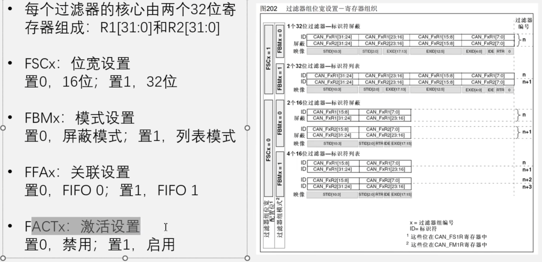 (1)16位列表模式:IdHigh,IdLow,MaskIdHigh,MaskIdLow这四个参数分别存入一组ID,可存4个标准ID