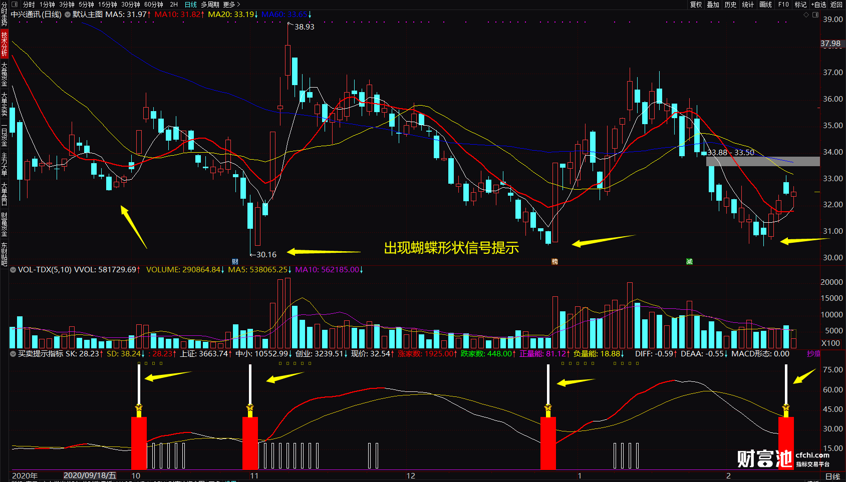 波段神器,无未来,信号极其准确,不是好用的指标不好分享给大家!这是指标用于显示选股下单的信号,只显示安全的做多做空信号,所以信号较少,少而准!对比一下就知道了!一个能及时提示上涨和下跌,有兴趣的朋友可以下载来试试!指标用法:买点:蝶形飞扬红柱或者出现红色线段在底部买入,预示着这个股票上涨的趋势,这个时候买入,可能会赚得更多!卖点:当白色线段出现预示将会是空方趋势,注意控制仓位!指标源码:https