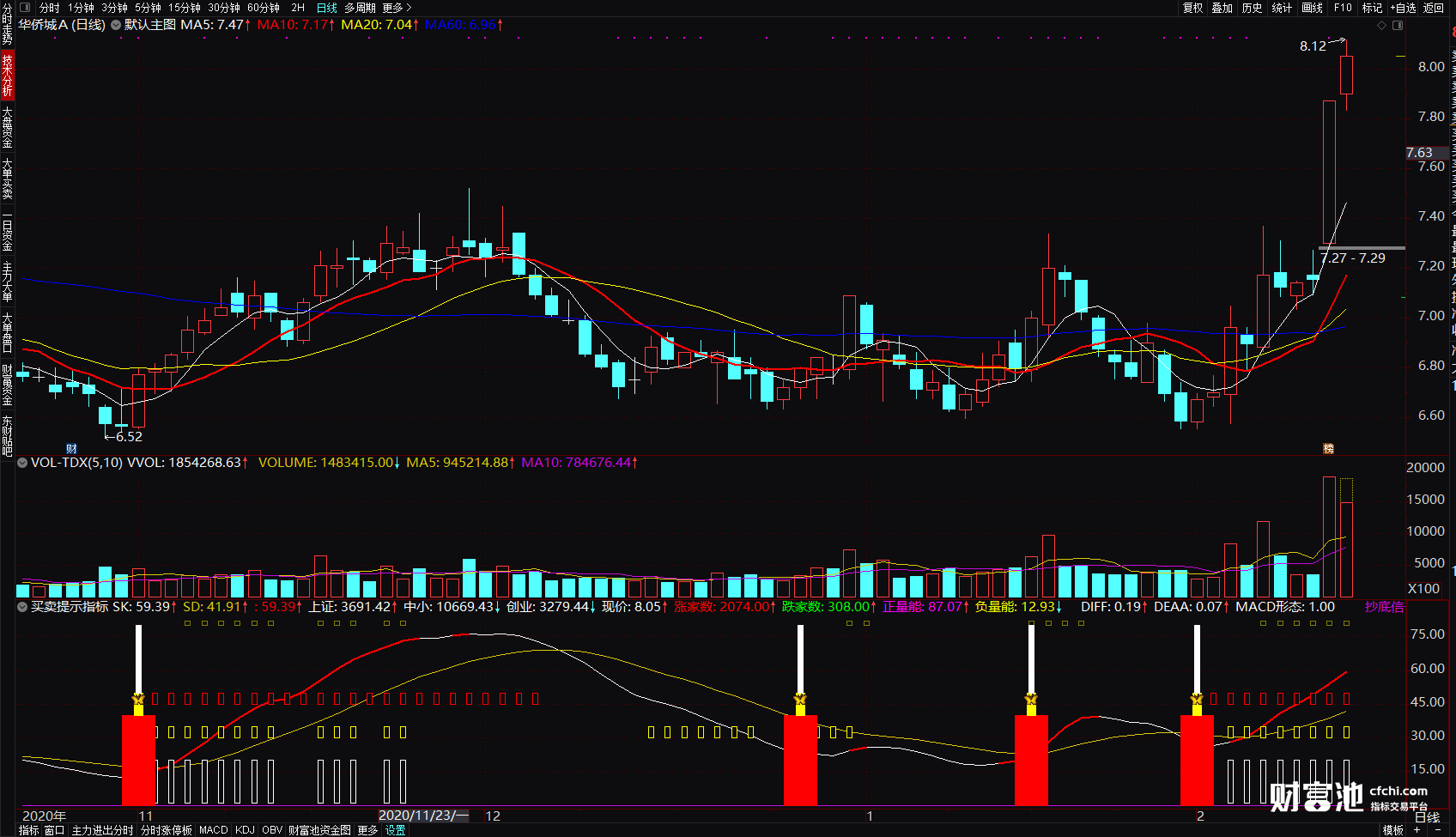 买点:蝶形飞扬红柱或者出现红色线段在底部买入,预示着这个股票上涨的趋势,这个时候买入,可能会赚得更多!