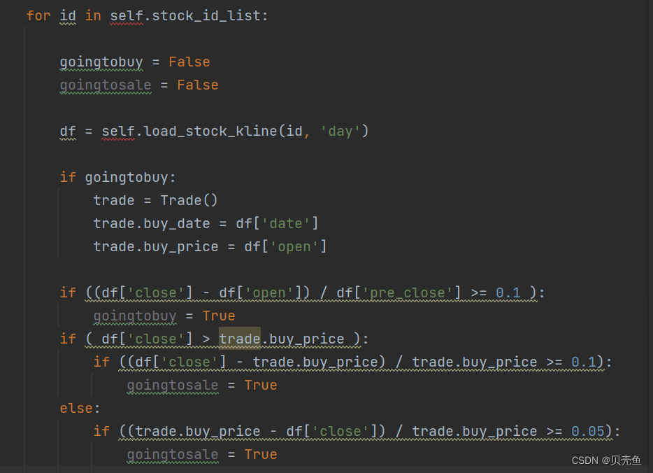 当然,现在的创业板和科创板都是20%的涨停限制了,这个我们还是按照沪深主板的规则来算。 如果对程序不熟悉的小伙伴其实对理解这个逻辑还是有点困难, 但是如果你了解编程,大概就会有个思路, 比如先加载 每只股票的 csv 文件,然后把需要判断的时间区间设定好, 在这个时间区间内去按照涨停逻辑 把这些股票筛选出来,就完成了第一步的选股, 那么买入逻辑很简单,只是按照第二天开盘价买入, 所以你需要创建一个交易类, 每一次选出来的股票后,创建一个交易类的对象,把买入时间,买入价格保存在这个交易对象中,然后就是再次遍历后续的 K线行情, 如果某一天的收盘价大于买入价的比如 10个点, 那么就触发了卖出逻辑, 就可以按照下一个交易日的开盘价或者收盘价卖出。 小于5个点也是卖出,止损卖出。