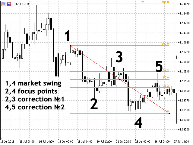 延伸, 回调和焦点 价格图表持续变化, 每次行情波段都应相对于图表进行回调。在此情况下, 每次波段均会扩展, 导致图表上焦点数量的变化。称为 "反弹" 的价格回调出现在行情波段的中间。它们中的每一个都有自己的索引。