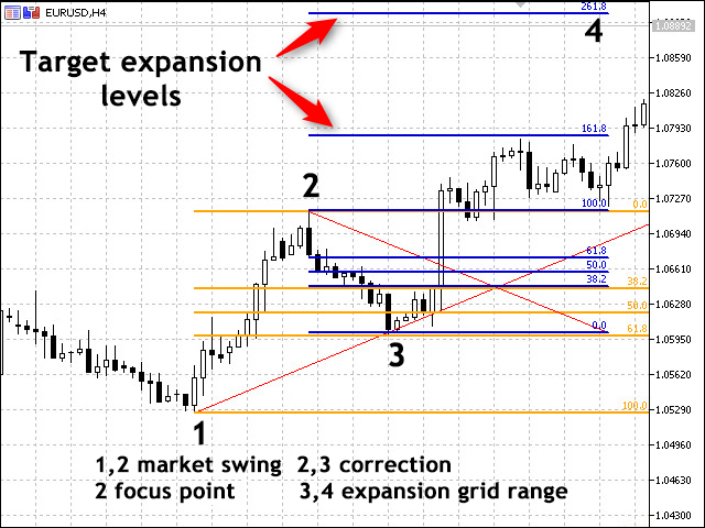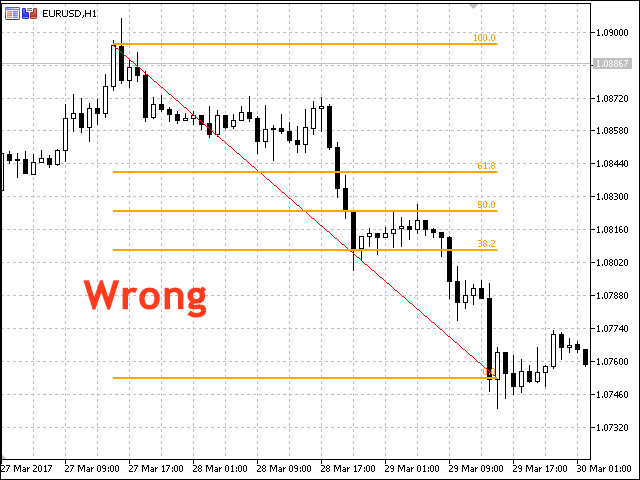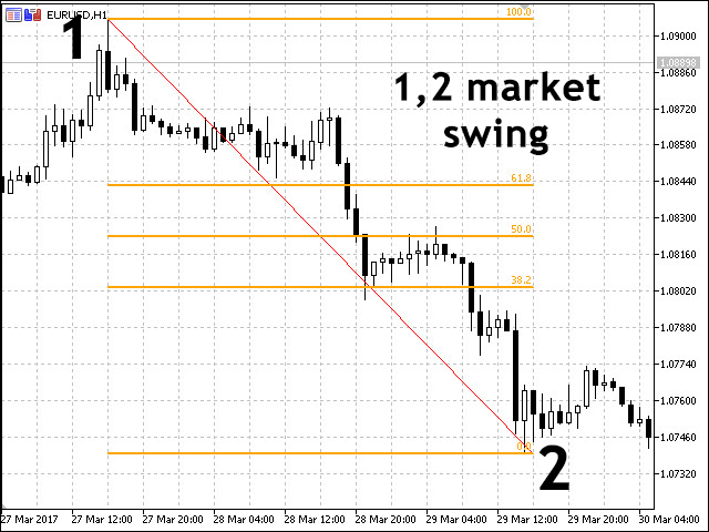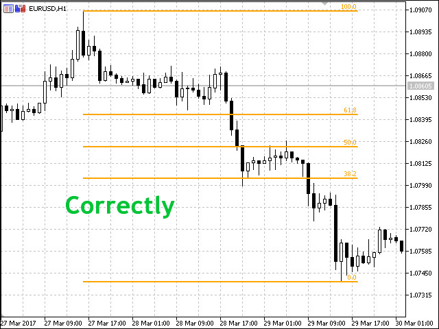 行情波段 (极值之间的距离) — 价格走势从开始到结束的距离, 菲波纳奇等级依此而绘制。如果在回调结束后价格最高点或最低点发生变化, 您还应该移动等级线的端点。在此情况下, 波段增长。