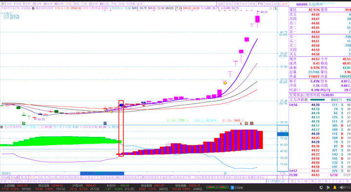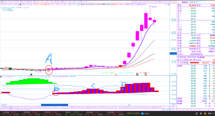 后面的B点紫色柱线没能上穿,强势没有出现,而在D点主力线再度拐头上行,出现了主力线上穿散户线,红柱和紫色柱线加长,行情开始强势拉升。这个D点的双线金叉也是加码或进场的有一个买点。