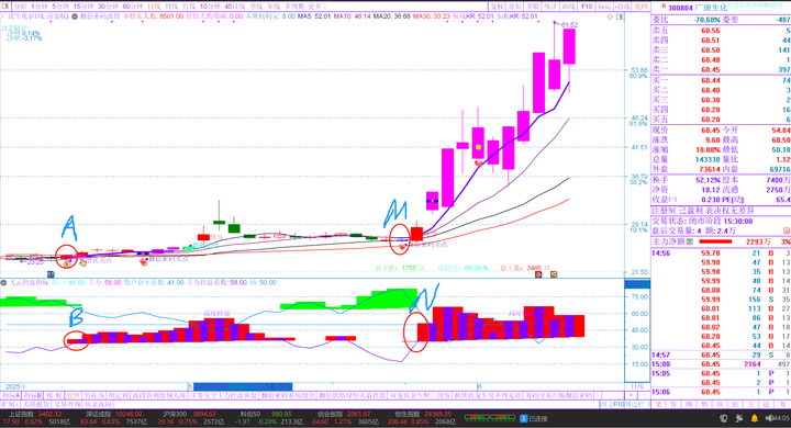 在上图的MN两个点上,M是主图的买点“翻倍密码买点”,N是副图指标的买点。