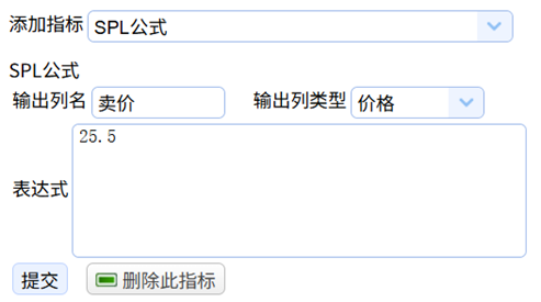 接着定义卖出价格列,第一步先重新点选一下添加指标下拉框,重新选择SPL公式(特别强调:即使当前已经是SPL公式了,也需要下拉点选一下,表示新建指标,否则会修改原指标),重新点选后会发现页面刷新了: