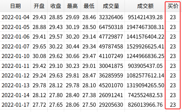我们来尝试做一个固定价格买卖策略,策略内容是这样的:如果当日股票的最低价低于23元,就买入;反之如果股票的最高价高于25.5元,就全部卖出。然后循环进行这个步骤,看下能否赚钱。