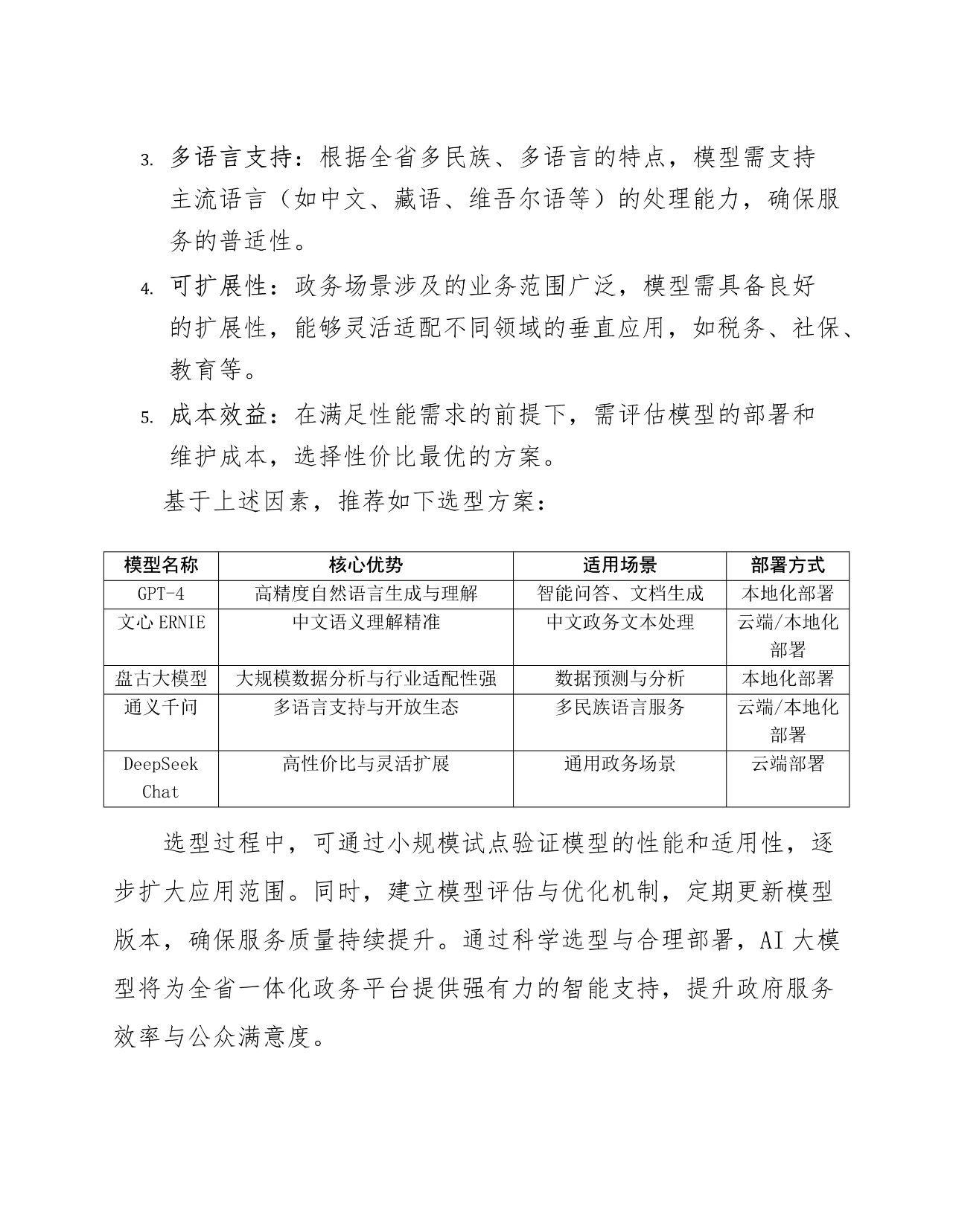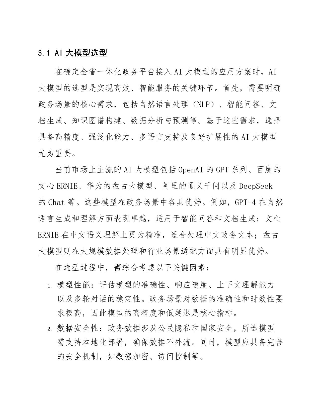 AI 大模型选型 :综合考虑政务场景需求,选择合适的 AI 大模型,如 GPT-4、文心 ERNIE 等,确保高精度、强泛化能力等。