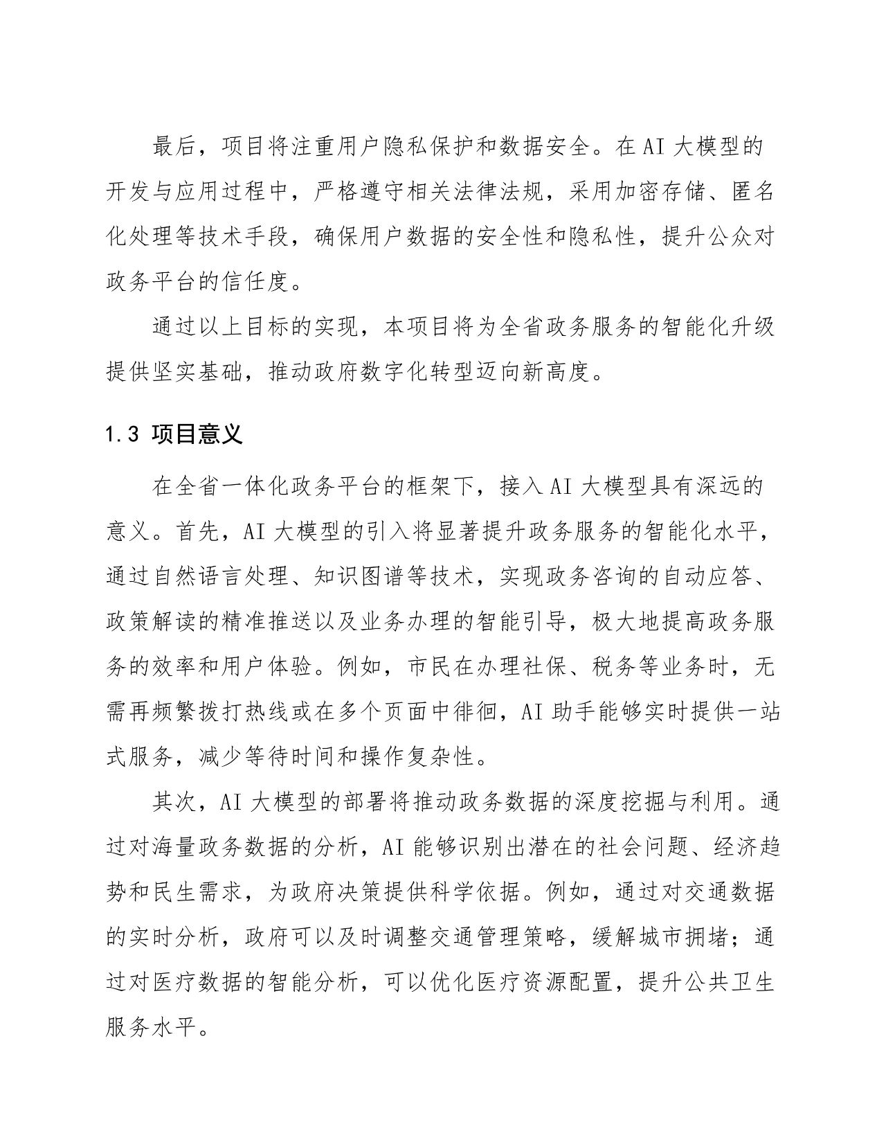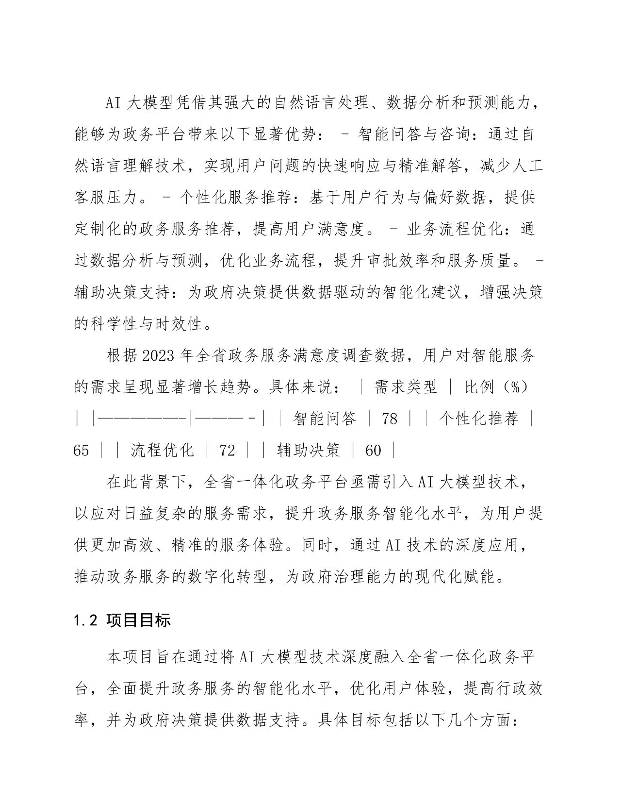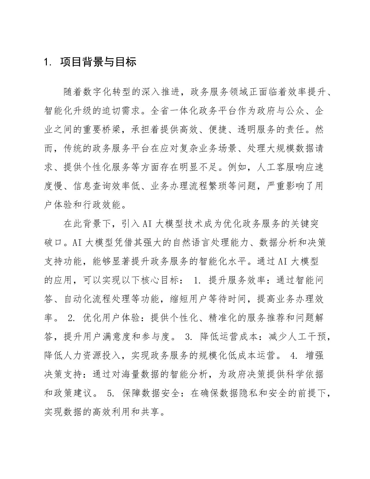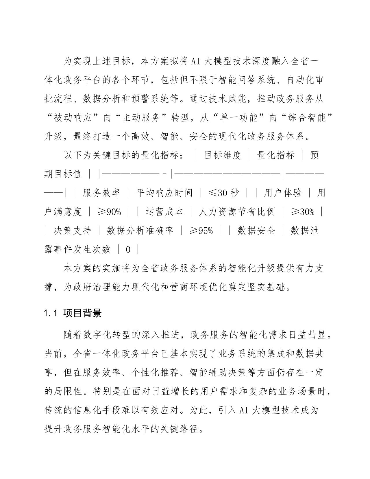 项目目标 :通过 AI 大模型技术提升服务效率、优化用户体验、降低运营成本、增强决策支持、保障数据安全,实现政务服务智能化升级。