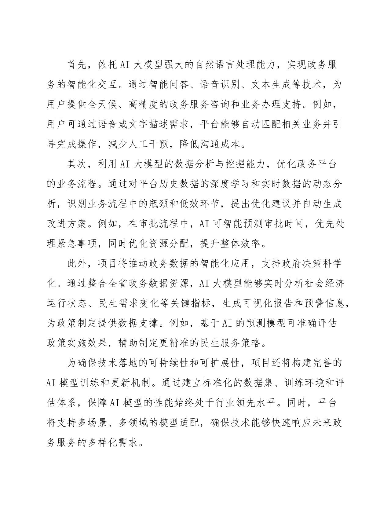 本文是一份详尽的《数字政府智慧政务 + AI 大模型接入及应用方案》,旨在通过引入 AI 大模型技术,全面提升全省一体化政务平台的智能化水平,优化政务服务流程,增强用户体验,降低运营成本,并为政府决策提供科学依据。
