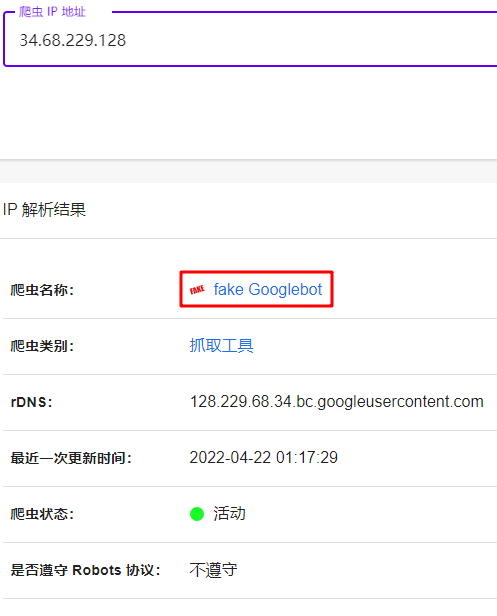 通过爬虫 IP 查询工具,我们便可以很轻松的识别假爬虫,例如: