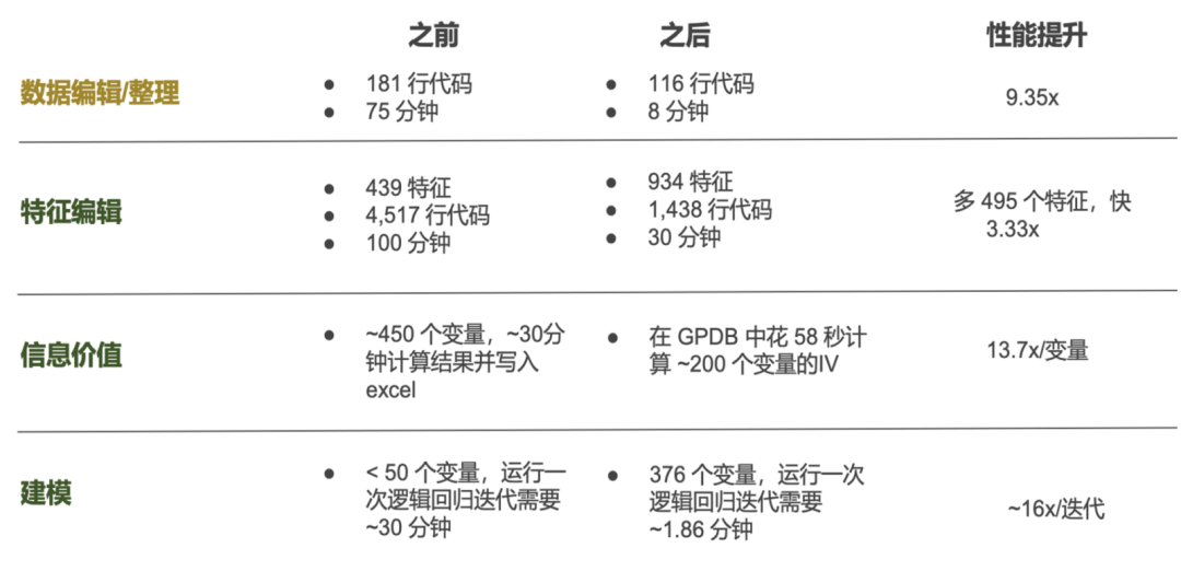 但在这个过程中,处理性能遇到了瓶颈。于是,该用户便采用了我们提供的功能和计算模型来进行了一系列优化,去掉了SAS和Excel,把包括数据整理,特征生成,模型预测等功能全放进了一个库里。