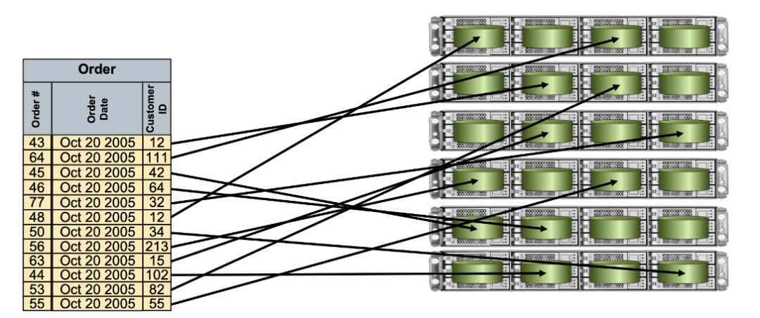 使用一款MPP数据库,最重要的策略和目标就是将数据均匀分布。MPP数据库会将数据进行分片,从而在并行处理的过程中,更快的得到结果。下图中有十二条二手游戏买号数据,十二条数据每条数据均会被放到不同的segment实例上。从而每个机器分到了2条数据。查询时,每个机器可能仅需要2个节点运行,便可以得到查询结果。相较于SMP架构中,在一台机器上用一个实例查询,性能的提升是不言而喻的。数据均匀分布后,我们在Master节点下发执行计划,来做二次查询时,多台机器是并行执行的,从而能够发挥所有服务器的能力,从而避免资源的浪费。