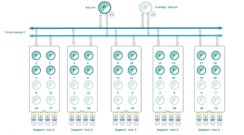 图中的架构可以被拆解为三部分来看,第一部分是上面的Master节点,第二部分是中间的高速交互网络,第三部分是下面的Segment 节点,是存储生产数据的地方,会利用多个不同的机器,将数据均匀分布在上面。例如图中使用了5台机器,数据会被均匀分布在这5台机器上,充分利用MPP架构的优势,5台机器同时运算,从而提高查询效率。