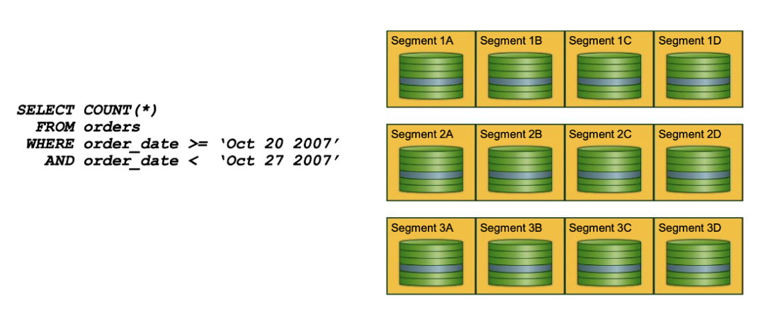 Greenplum的分区设计与Oracle较类似。与数据分布不同的是,分区是一个逻辑的概念,而数据分布是物理的概念。在创建分区表时,在每个segment都会创建同一套完整的,包括所有表结构的分区表。在每个segment查询时,会将无用的分区裁剪,将无用的数据进行过滤,从而提升查询效率。图中可以看到,每个segment上,只有蓝色的部分参与了查询。