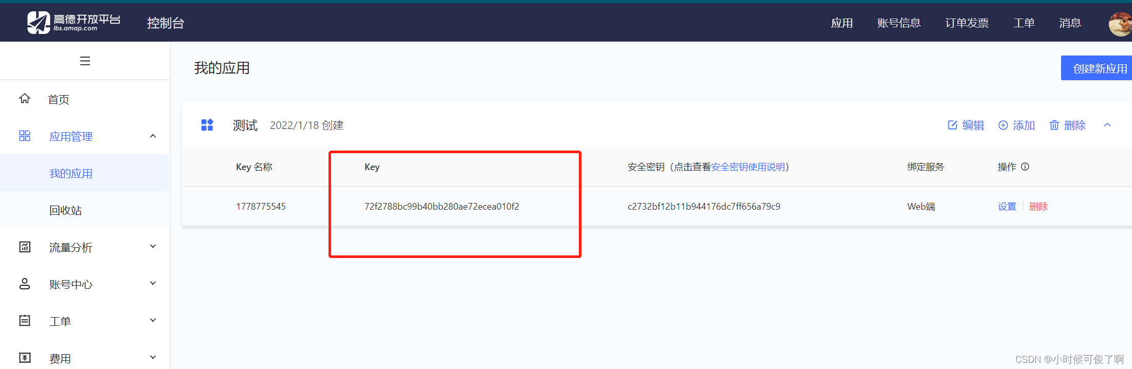第一步:在高德api开放平台申请应用,保存自己的key值