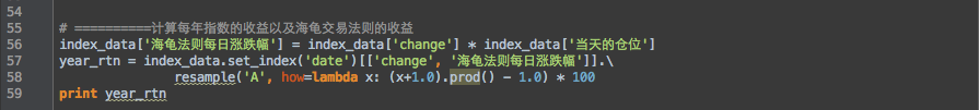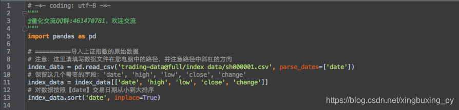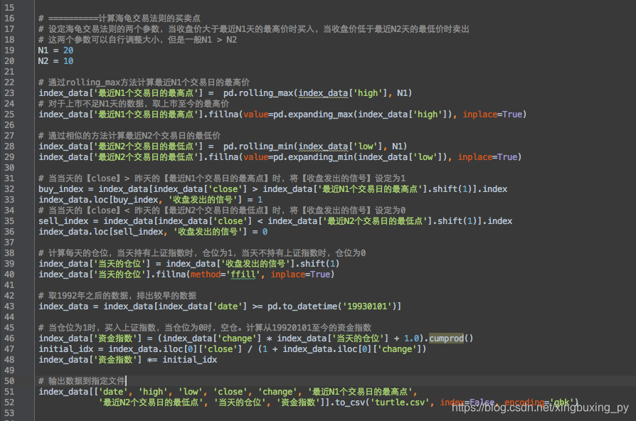 有了原始数据之后就是代码。我本以为用pandas实现这个策略还是稍微有点复杂,结果发现非常的简单,再次赞叹下pandas的方便。下面是代码的截图,里面有详细的注释,有问题可以留言。需要代码可以加我微信xingbuxing0807索要。