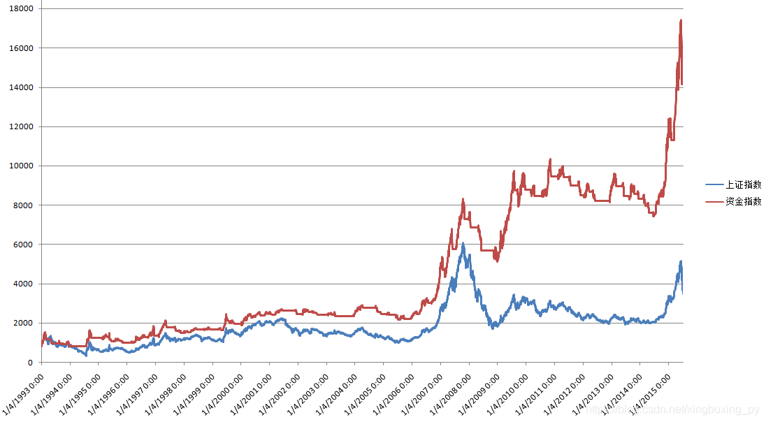 把数据下载下来,运行代码,就可以看到输出的结果了。下面这张图展示了从1993年1月1日开始,使用海龟交易法则交易上涨指数的资金曲线与原指数的对比,由图中可见,指数从800多点涨到了现在的400点,而海龟交易法则的资金曲线,从同样的800多点,涨到了14000点。