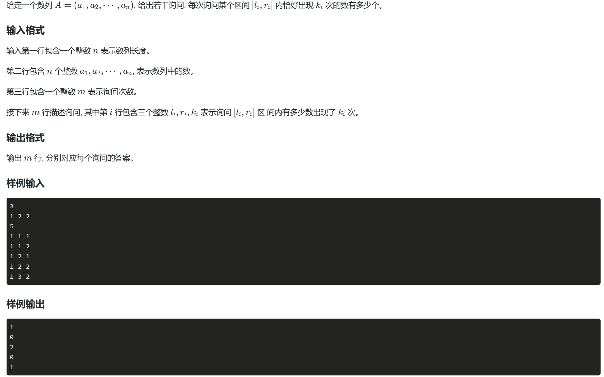 给定一个长度为 n 的整数序列 A,以及 m 个查询。每个查询包含三个数 (l, r, k),求:数组 A 的第 l 到第 r 个数中,恰好出现 k 次的不同整数有多少个?这道题的关键在于转化为区间频次统计问题,然后使用莫队进行优化,重要的需要掌握:区间统计建模莫队排序规则增删函数的正确性