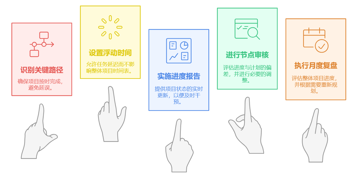 - 关键路径的每个任务都要设“浮动时间”,超了就报警。