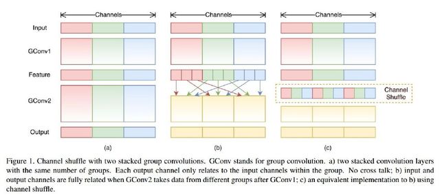 其中 group convolutiosn 非原创,而 channel shuffle 是原创。channel shuffle 因 group convolution 而起,正如论文中 3.1 标题: . Channel Shuffle for Group Convolution;
