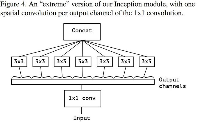 假设出一个简化版 inception module 之后,再进一步假设,把第一部分的 3 个 1*1 卷积核统一起来,变成一个 1*1 的,后面的 3 个 3*3 的分别「负责」一部分通道,如图 3 所示; 最后提出「extreme」version of an Inception,module Xception 登场,,先用 1*1 卷积核对各通道之间(cross-channel)进行卷积,如图 4 所示,