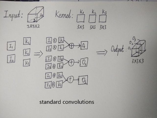 Standard 过程如下图,X 表示卷积,+表示对应像素点相加,可以看到对于 O1 来说,其与输入的每一个 feature map 都「发生关系」,包含输入的各个 feature map 的信息。