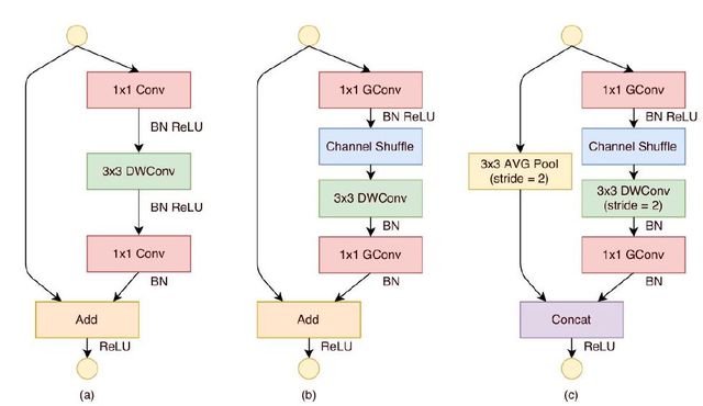 图 (a):是一个带有 depth-wise convolution 的 bottleneck unit;图 (b):作者在 (a) 的基础上进行变化,对 1*1 conv 换成 1*1 Gconv,并在第一个 1*1 Gconv 之后增加一个 channel shuffle 操作;图 (c): 在旁路增加了 AVG pool,目的是为了减小 feature map 的分辨率;因为分辨率小了,于是乎最后不采用 Add,而是 concat,从而「弥补」了分辨率减小而带来的信息损失。