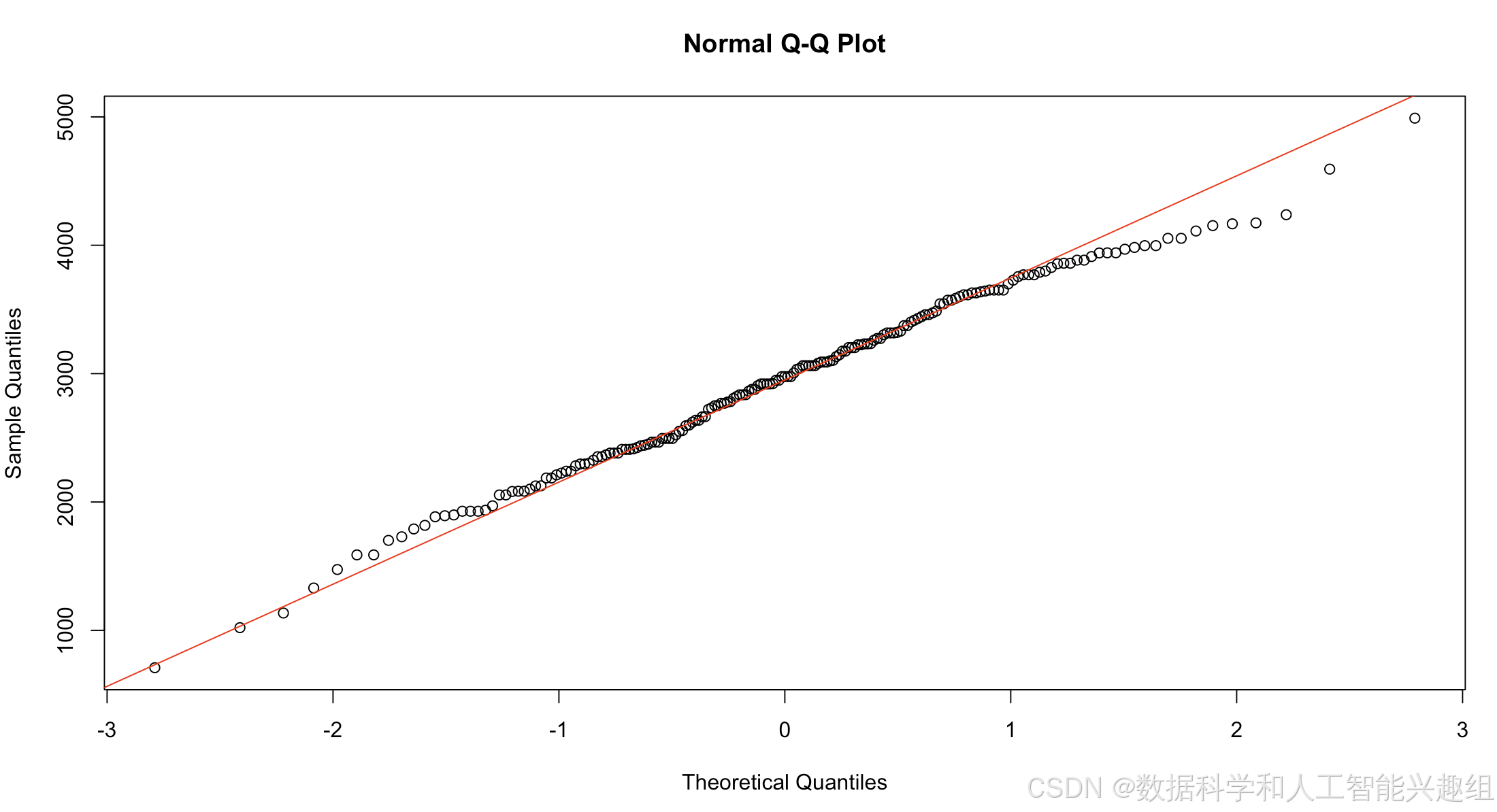 在R中,可以使用qqnorm()函数绘制Q-Q图,结合qqline()函数添加对角线。以下代码绘制了新生儿出生体重数据的Q-Q图。结果显示数据点大致分布在对角线附近,表明数据近似服从正态分布。