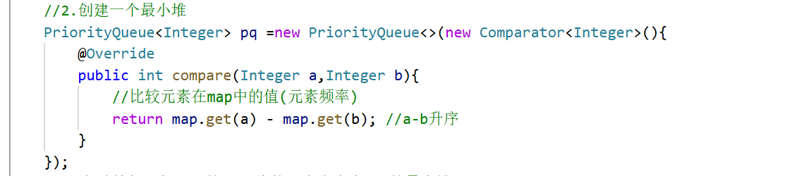 PriorityQueue<Integer> pq=new PriorityQueue<>((a,b) -> map.get(a)-map.get(b));
