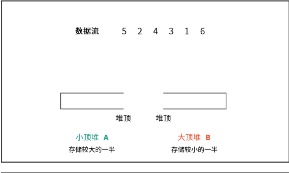 用大顶堆存较小一半数,小顶堆存较大一半数,通过平衡两堆大小来快速获取中位数。 |