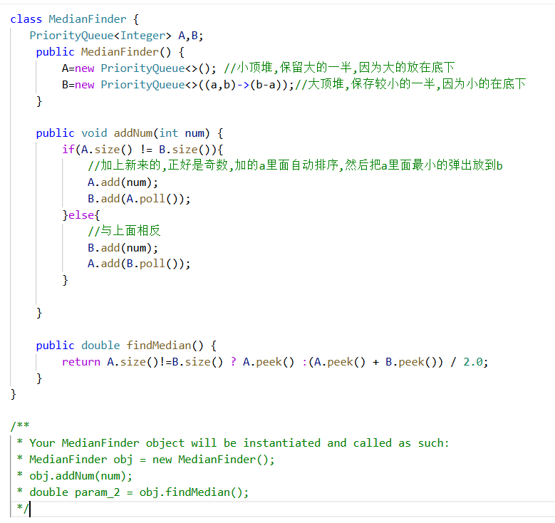 A=new PriorityQueue<>(); //小顶堆,保留大的一半,因为大的放在底下
