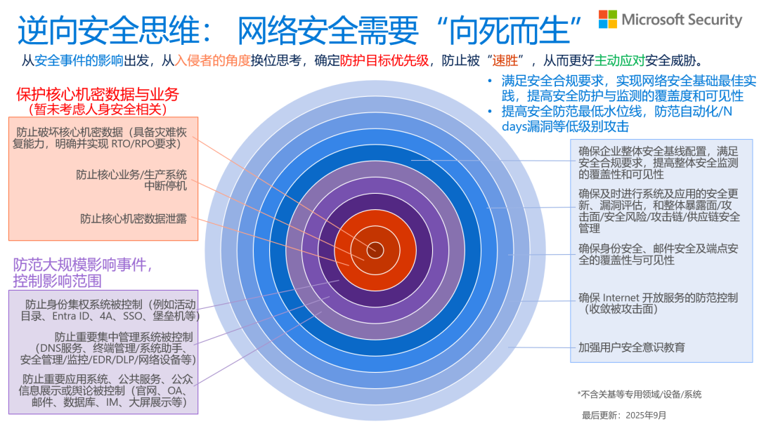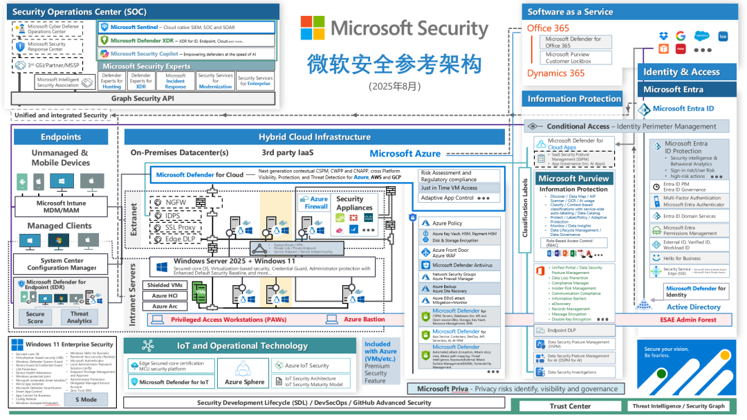 企业应该建立全面、系统的网络安全体系和防护能力(例如参考下图最新的微软安全参考架构),从硬件防护、软件更新到员工培训,全方位提升安全水平,具体措施可以包括安装防火墙、防病毒软件、加密重要数据等。此外,还需要定期进行主动安全检测,及时发现和修复漏洞。