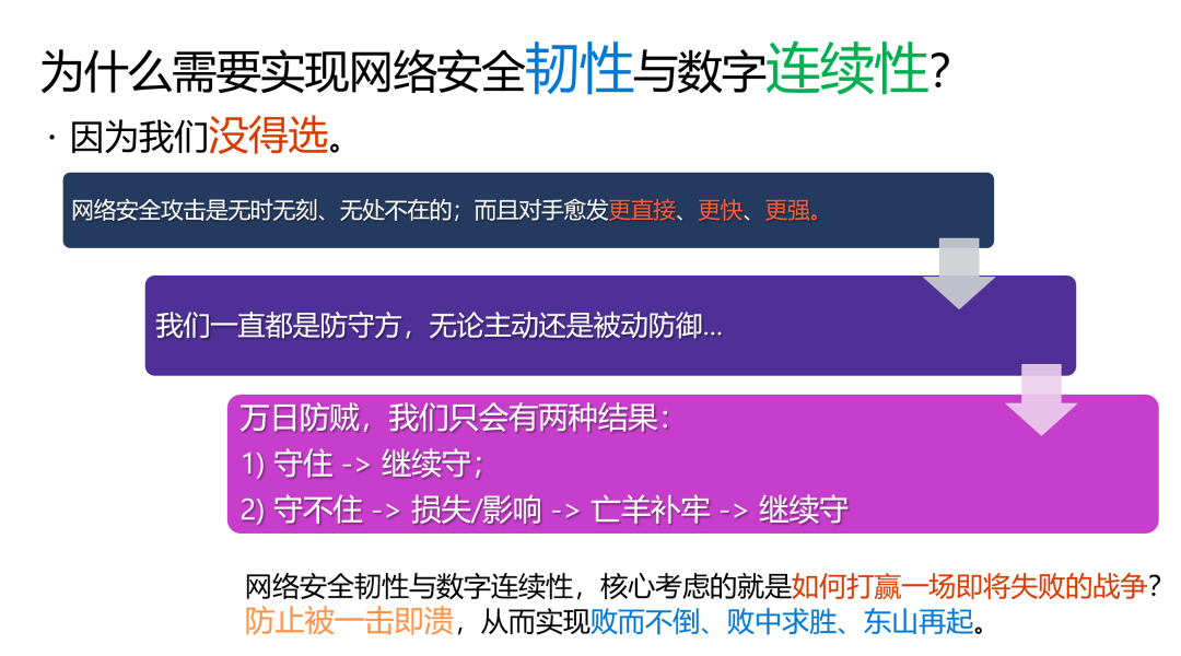 “你见、或者不见我,我就在那里,不悲、不喜”。这句深情款款的诗,却道出了网络安全威胁的本质:它是无时无刻、无处不在的。在网络安全方面,企业一直都是应对攻击的防守方,因此我们只可能会出现两种情况:守住,或者没有守住。从长期性的现实角度来看,我不认为企业可以完全避免发生网络安全事件,因此企业可以分为两种,一种是已经发生了网络安全事件,一种是即将发生网络安全事件。而目前比较流行的网络安全韧性与数字连续性话题,核心考虑的就是如何打赢一场即将失败的战争?防止被一击即溃,从而实现败而不倒、败中求胜、东山再起。