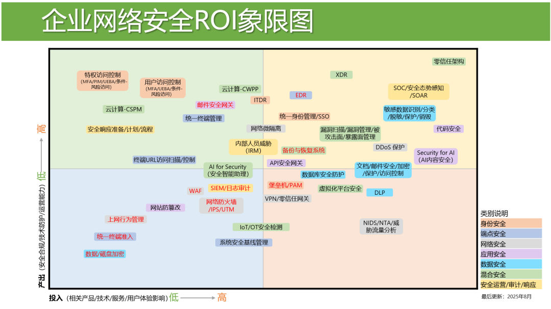 这个企业网络安全ROI象限图可以帮助大家快速判断不同安全技术的投资回报率,为企业制定网络安全发展路线图(Roadmap)提供有价值的参考。