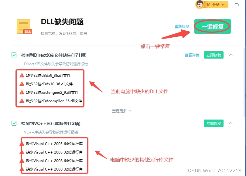 3、再点击“一键修复”即可,自动下载安装各种缺失DLL文件,以及DirectX库、Microsoft Visual C++库等;