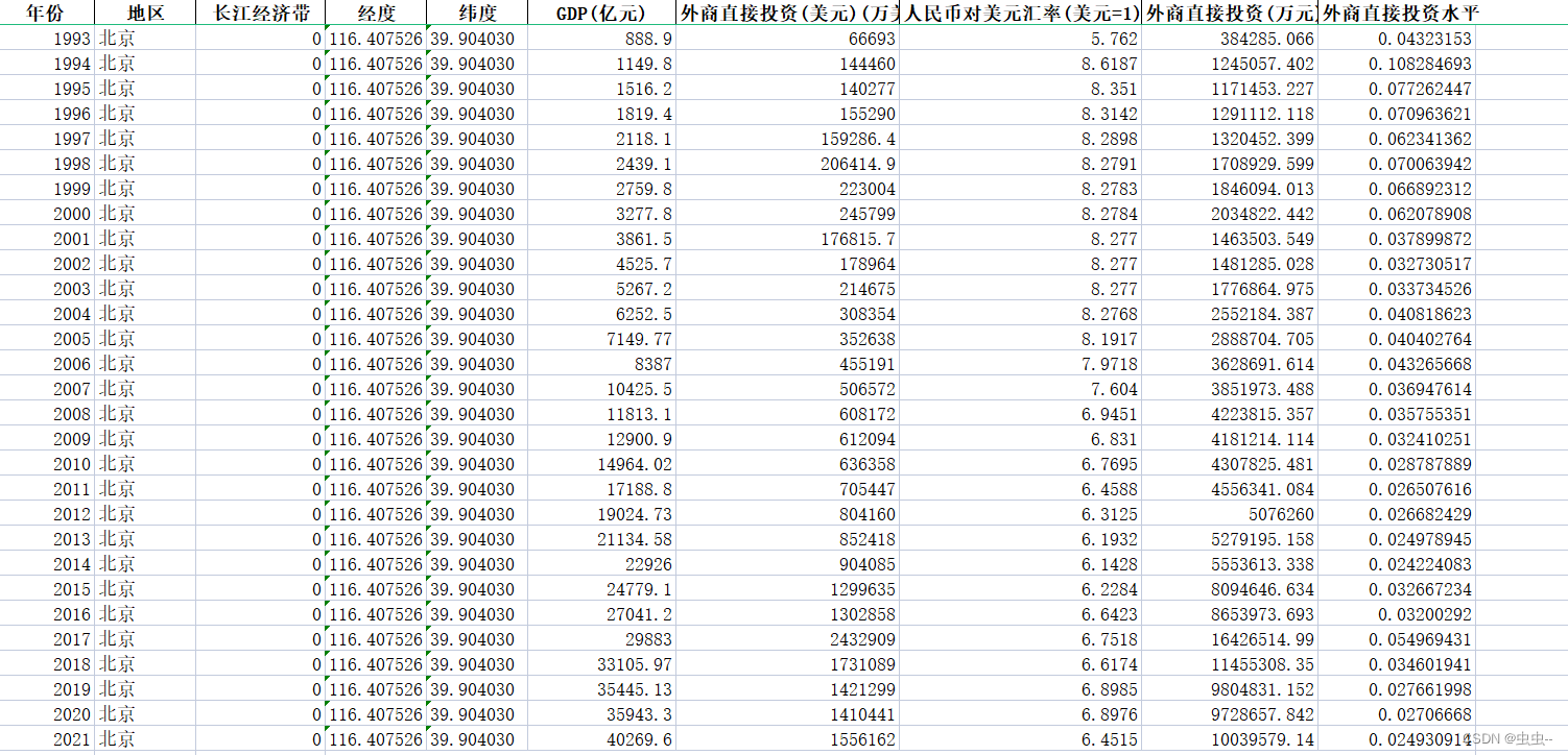 2、指标包括: 行政区划代码、长江经济带、年份、地区、经度、纬度、GDP(亿元)、外商直接投资(美元)(万美元)、人民币对美元汇率(美元=1)(元)、外商直接投资(万元)、外商直接投资水平
