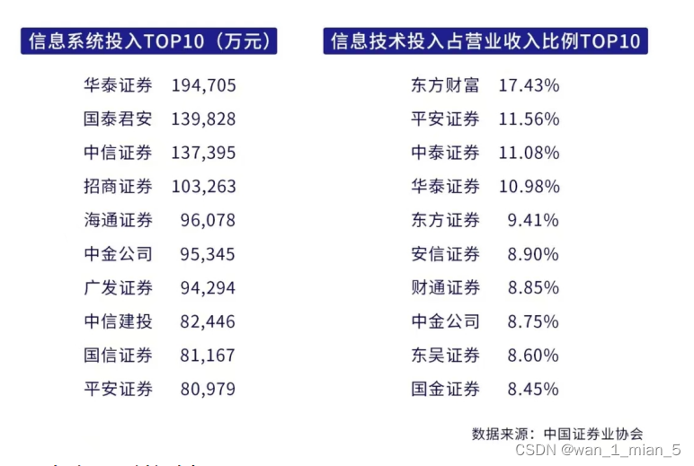 各家证券公司对金融科技如何赋能业务条线的布局各有不同,但持续加大信息技术领域投入,上线智能交易系统,已成为共识。下图是券商2020年经营业绩指标中信息系统及技术的投入费用排名,在金融科技加速重塑证券行业的背景下,各大券商在信息系统方面的投入也与日俱增。