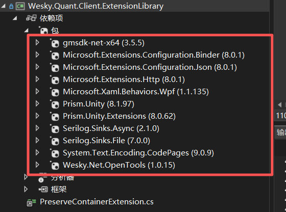 Wesky.Quant.Client.ExtensionLibrary拓展程序目前安装以上这些nuget包,如果喜欢自己动手实践的,建议采用同版本的包。
