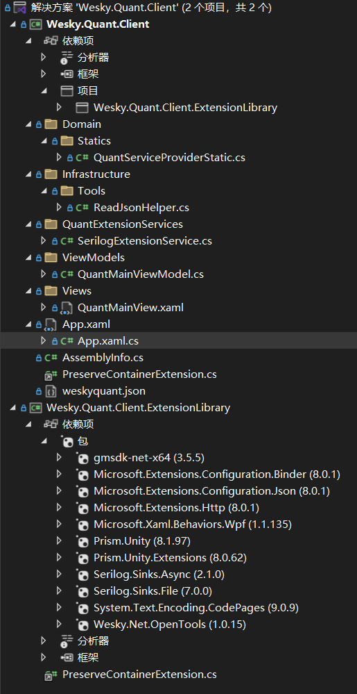 Wesky.Quant.Client是主程序,Wesky.Quant.Client.ExtensionLibrary是拓展程序,主要用于安装外部nuget包。