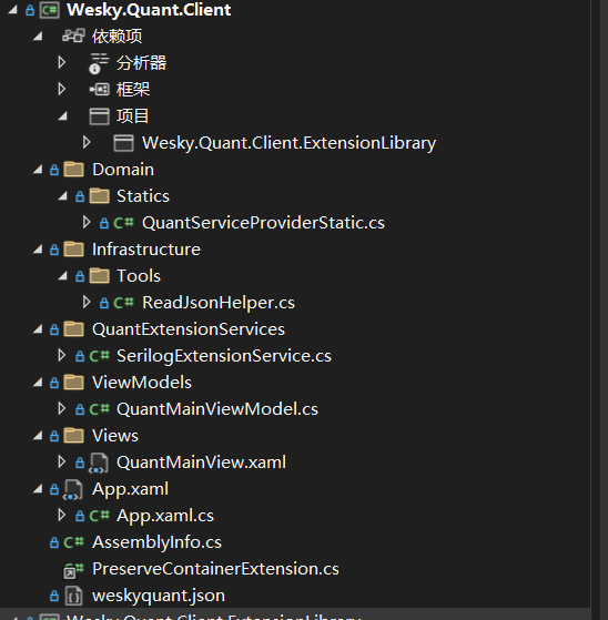 Wesky.Quant.Client主程序,目前包含几个简易结构,Domain文件夹下面用来存放策略、通用服务或者业务等内容,Infrastructure文件夹打算用来存放工具箱、底层基础服务等,目前已有一个读取Json配置文件的帮助类;QuantExtensionServices文件夹会用来存放拓展服务类,一般是启动程序时候进行加载的拓展服务类,例如日志配置服务等;ViewModels和Views是Prism框架的一个开发规范,默认客户端页面(View)和VM业务层(ViewModel)分别存放这两个文件夹下面,prism框架会自动识别。App.xmal是启动项,上面可以进行一些配置,类似webapi程序的startup启动项。