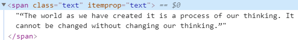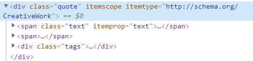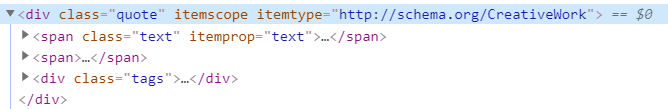 <Selector xpath="descendant-or-self::div[@class and contains(concat(' ', normalize-space(@class), ' '), ' quote ')]" data='<div class="quote" itemscope itemtype...'>,