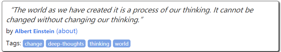 {'text': '“The world as we have created it is a process of our thinking. It cannot be changed without changing our thinking.”', 'author': 'Albert Einstein', 'tags': ['change', 'deep-thoughts', 'thinking', 'world']}